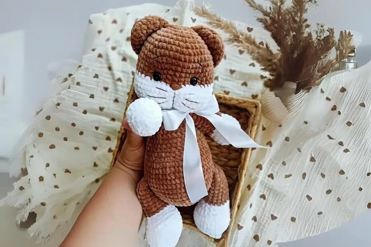 - Yarn: Wolans Bunny Baby (100% polyester, 100 g/120 m) #41 (brown), #01 (white); YarnArt Jeans (55% cotton, 45% acrylic, 100 g/160 m) #53 (black) for eyelashes and brows, #62 (white) for eye whites, #40 (brown) for a nose and whiskers