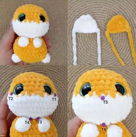 Sew the ears between rows 18 and 22, leaving 4 SC between them. Embroider the white part of the eyes, eyelids, eyebrows, and the nose bridge in the center of the face. Attach the nose.