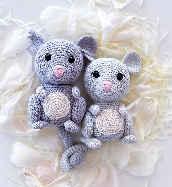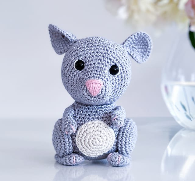 - Yarn: I used fingering weight cotton yarn, Scheepjes Catona (1 skein for 1 chinchilla). Colors used: Mercury (074) and Light Silver (172). Some leftovers of creme and pink.
