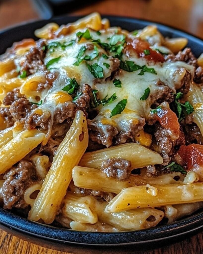 - Add the cooked pasta, beef, and vegetables to the skillet, tossing everything in the creamy sauce until well coated. Adjust seasoning with salt and pepper if necessary.